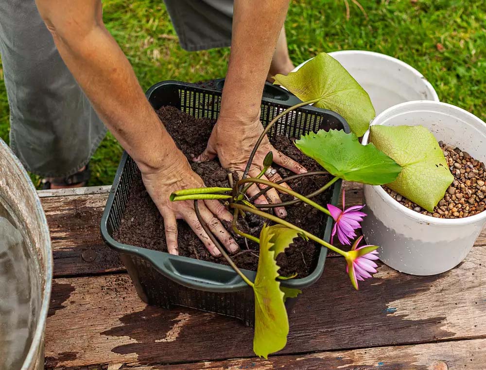 Slowly lower the planted container into the pond to the desired depth. Most aquatic plants prefer water depths specific to their species. Water lilies and lotuses, for example, typically thrive in water depths of 12-36 inches.
